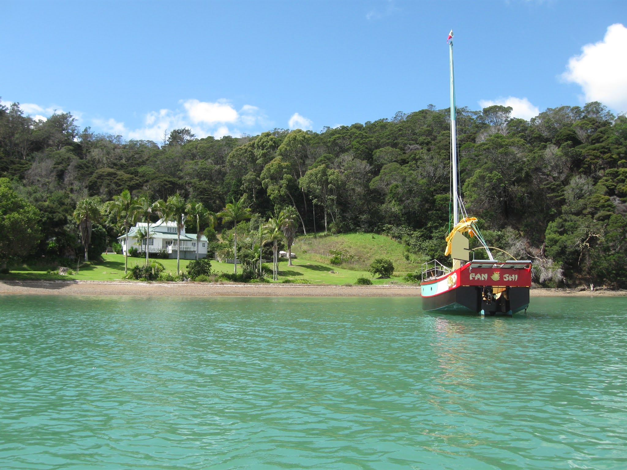 Another NE gale was was forecast and at first I thought I’d sit it out in Whangateau. However, the longer term forecasts were talking of at least a week of E winds, which would build up a swell. I wasn’t entirely sure that this wouldn’t find its way in to where I was anchored, and I was certain that I didn’t fancy crossing the bar at the entrance until the swell had died down. Thus, the next day I sailed round to Kawau I, which shelters a large bay and provides a choice of anchorages, such as North Cove and Bon Accord. The sail looked a lot happier when I hoisted it and we had a pleasant sail to North Cove, where my friend, Mike, had organised a mooring for me. I stayed there for several days while the wind howled outside, but only the odd gust moved us around. It must be about the most sheltered mooring in that very sheltered harbour!